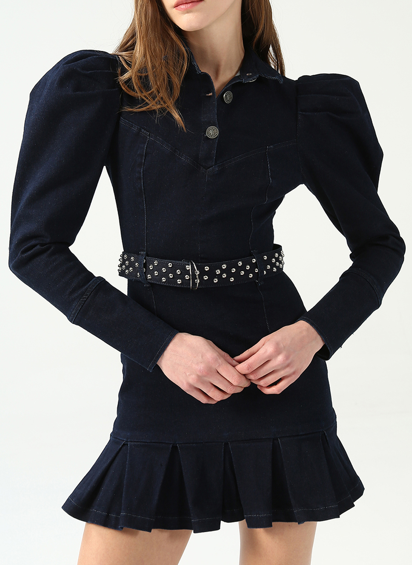 RG-112 Karpuz kol eteği pileli denim gömlek elbise