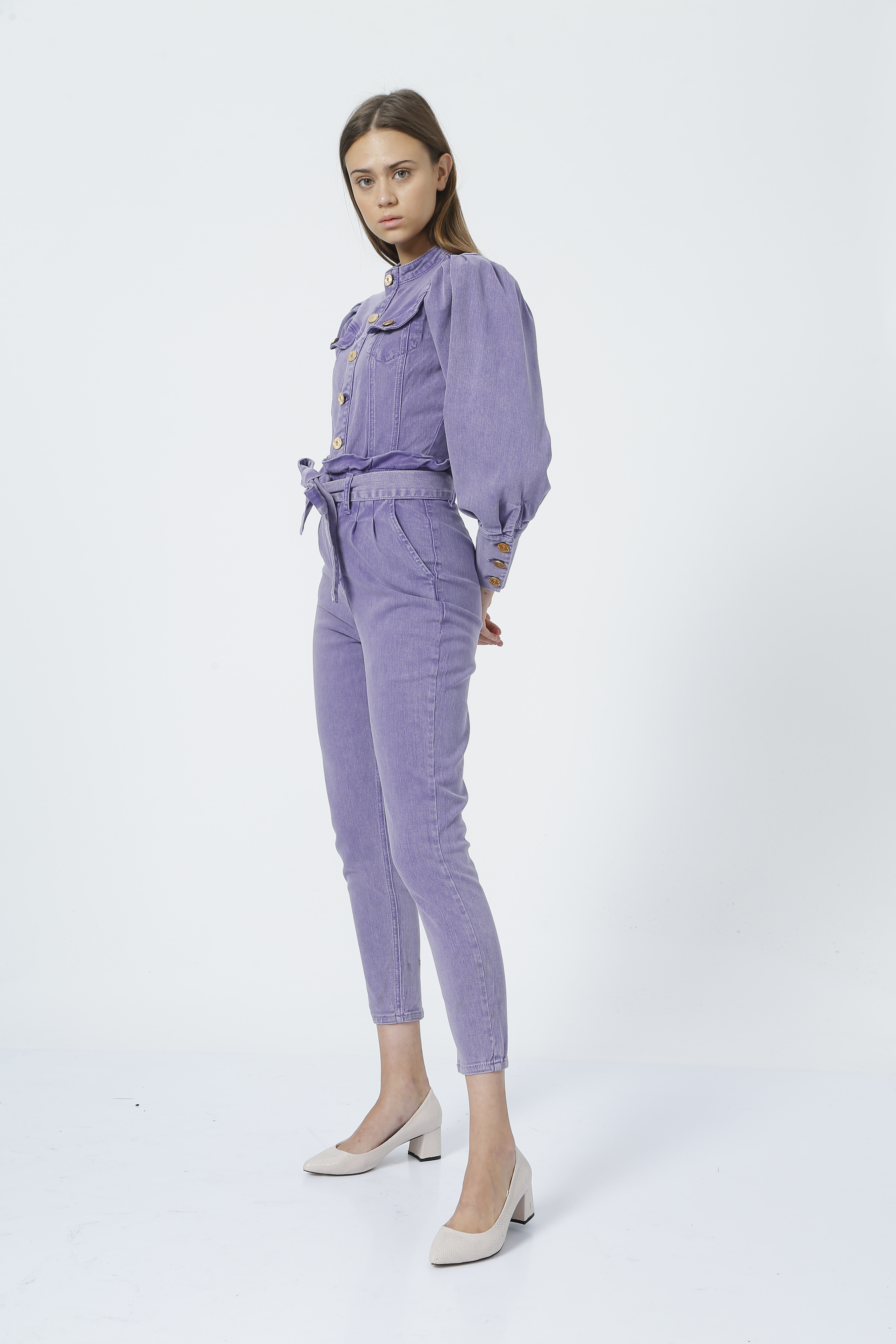 RG-700 Karpuz Kol Beli Fırfır Detay Dar Paça Mor Tulum