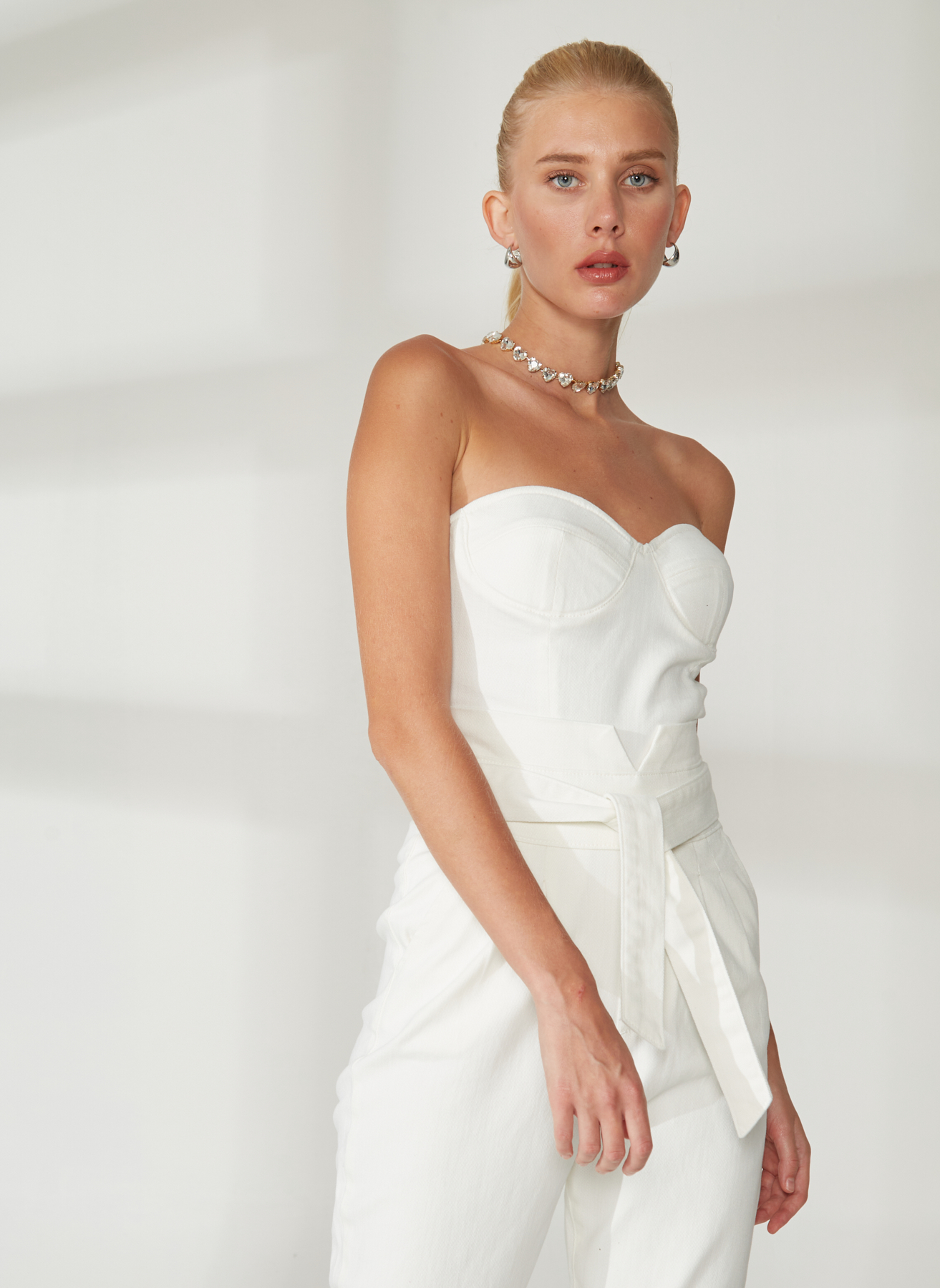 RG-702 Straplez beyaz denim tulum