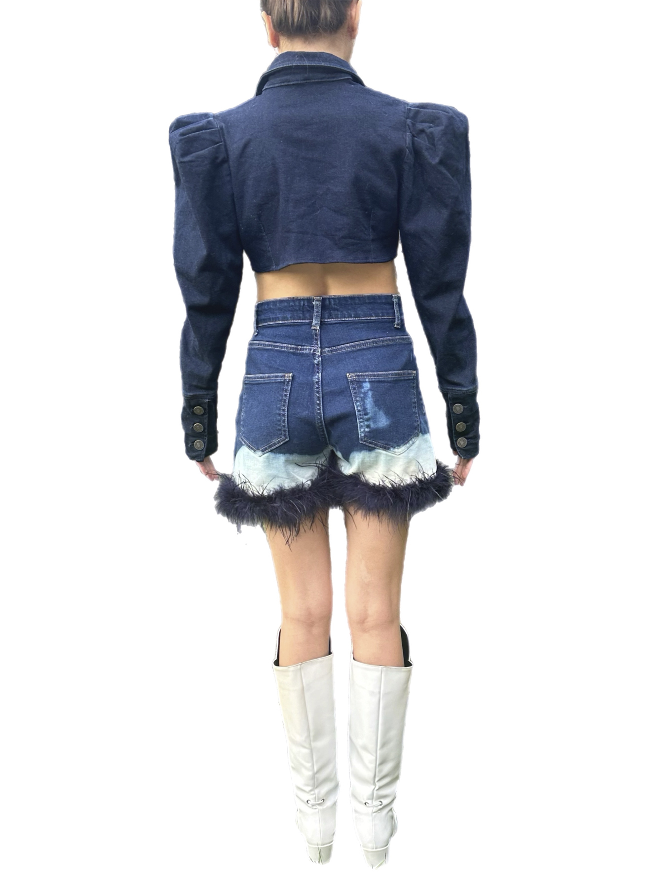 Taş detay tüy ve fırfırlı mini denim etek