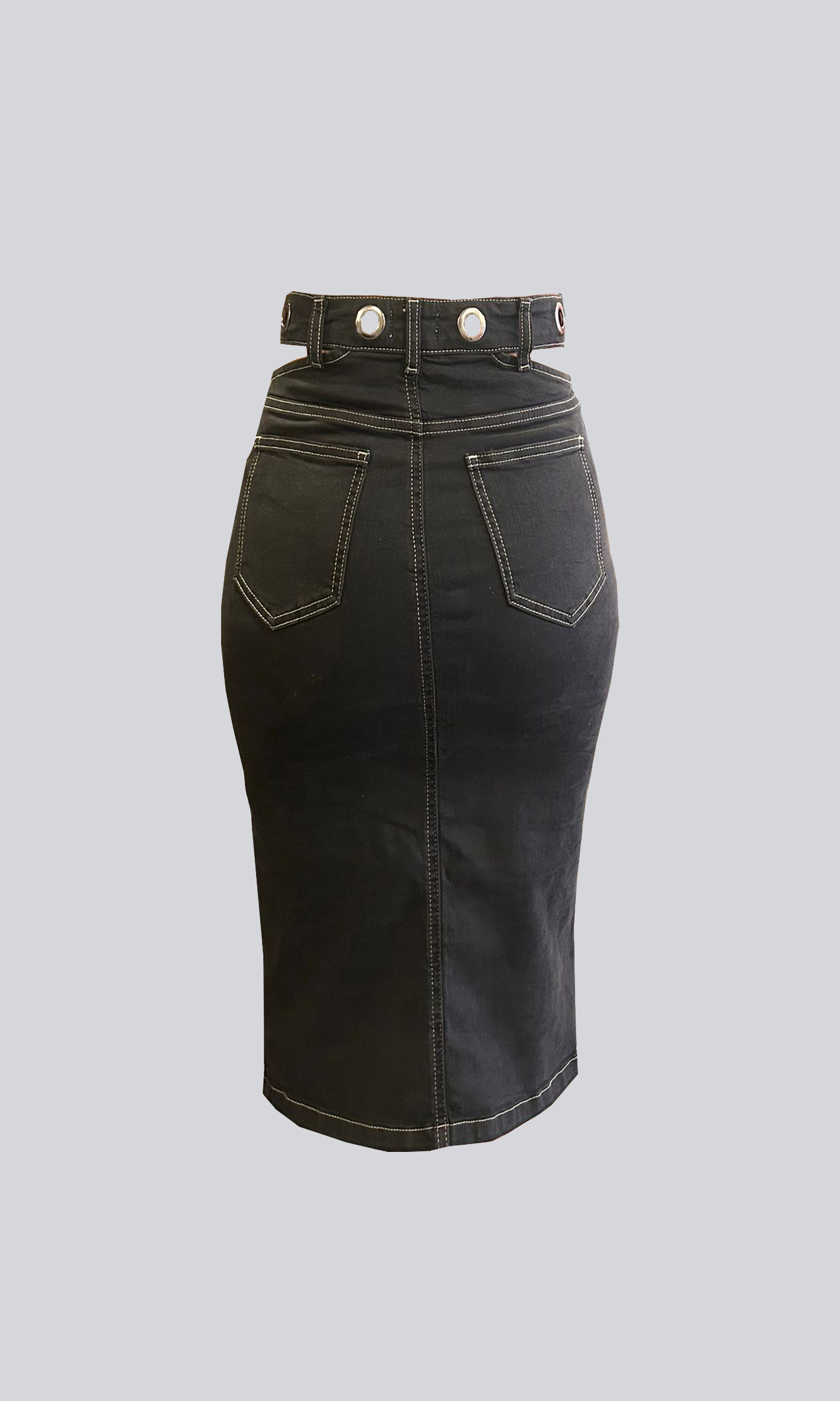 Kuşgözü detaylı yırtmaçlı denim etek