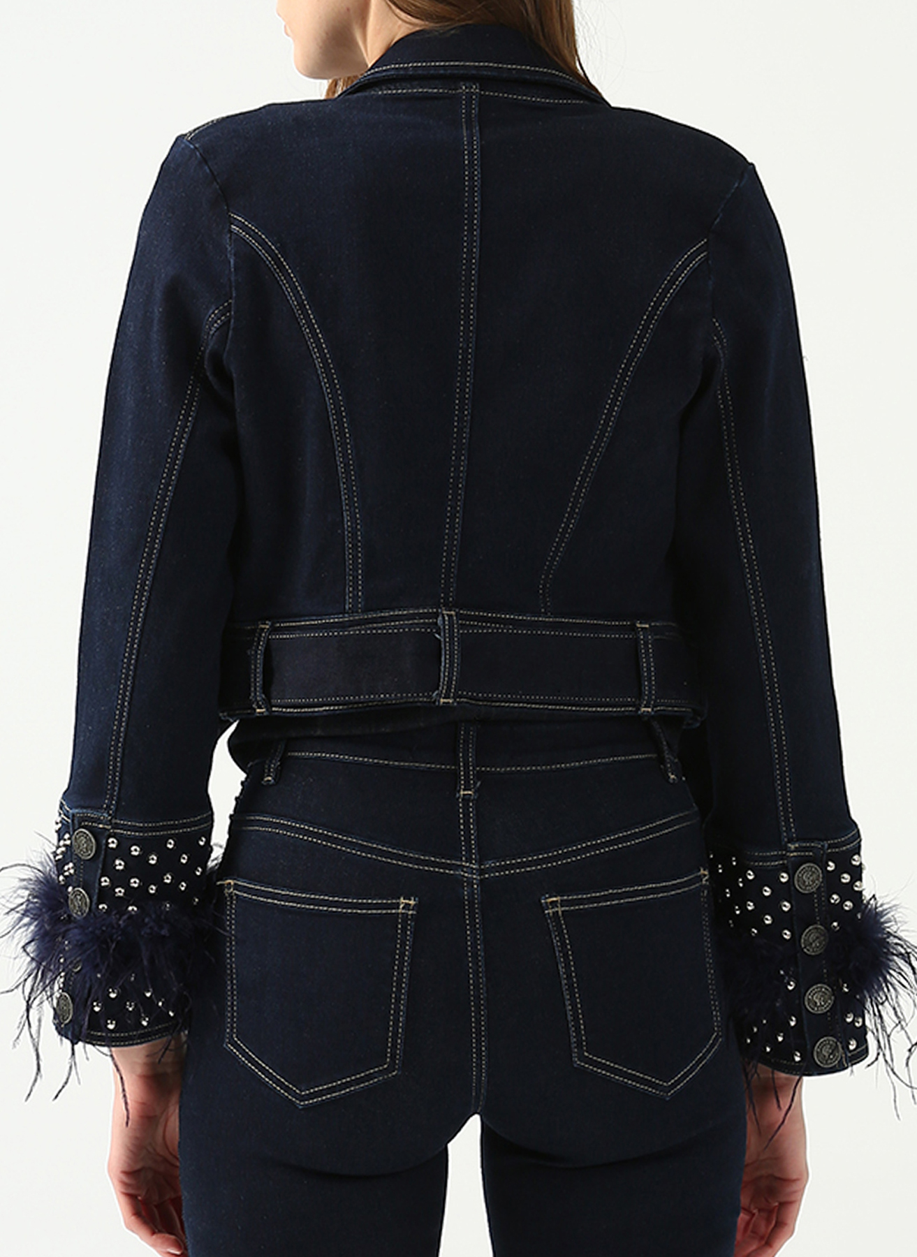 RG-609 Trok ve tüy detay kruvaze denim ceket